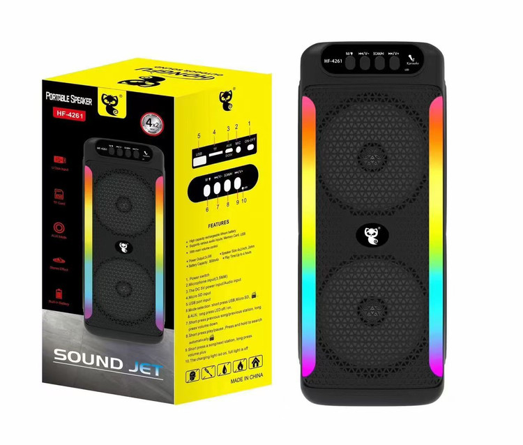 سپیکر قابل حمل مدل SOUND JET HF-4261 یک گزینه اقتصادی و چندمنظوره برای استفاده خانگی، تفریحی و حتی نیمهحرفهای است. در ادامه، مشخصات کامل و کاربردهای آن را بهصورت دستهبندیشده ارائه میدهم: