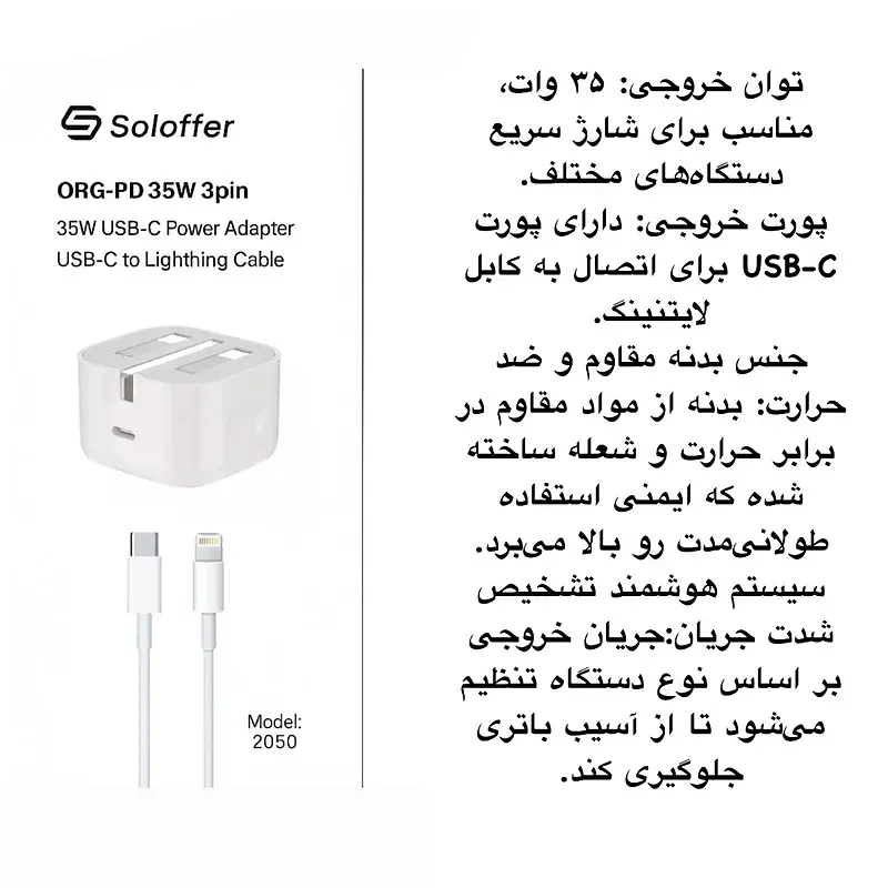 متاسفانه این کالا در حال حاضر موجود نیست. میتوانید از طریق لیست بالای صفحه، از محصولات مشابه این کالا دیدن نمایید.شارژر ۳۵ وات برند سولوفر یک انتخاب حرفهای و قدرتمند برای کاربرانیست که به دنبال شارژ سریع، ایمن و سازگار با دستگاههای اپل هستند. این شارژر با پشتیبانی از فناوری Power Delivery (PD) و توان خروجی ۳۵ وات، امکان شارژ سریع انواع گوشیها، تبلتها و سایر گجتهای هوشمند را فراهم میکند.این محصول به همراه یک کابل USB-C به Lightning عرضه میشود که دارای چیپست MFi اورجینال بوده و کاملاً با دستگاههای اپل از جمله iPhone، iPad و AirPods سازگار است.از دیگر ویژگیهای این شارژر میتوان به طراحی جمعوجور، سیستم هوشمند محافظت در برابر نوسانات برق، اتصال کوتاه و گرمای بیش از حد اشاره کرد. همچنین با داشتن ولتاژ ورودی ۱۰۰ تا ۲۴۰ ولت، این شارژر گزینهای مناسب برای استفاده در سفر نیز بهشمار میآید.